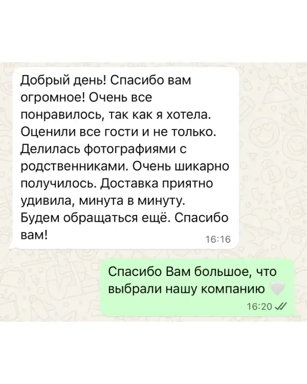 Мы понимаем, что важные моменты не всегда происходят днём. Именно поэтому доставка осуществляется 24/7. Хотите устроить сюрприз в полночь, поздравить с самого утра или организовать оформление перед началом мероприятия? Достаточно купить подходящую композицию и указать удобное время — мы обеспечим своевременную и аккуратную доставку.